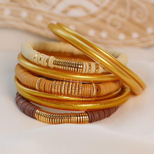 In questo set d'ispirazione, ti mostriamo come creare bracciali che puoi combinare alla perfezione con i braccialetti tempio buddista. Scegli un colore di perline Katsuki e infilale sul filo elastico. I veri braccialetti buddisti hanno un raccordo in oro con un mantra inciso. Infilando le perline a rondella dorate in metallo DQ al centro del tuo bracciale, creerai lo stesso effetto!