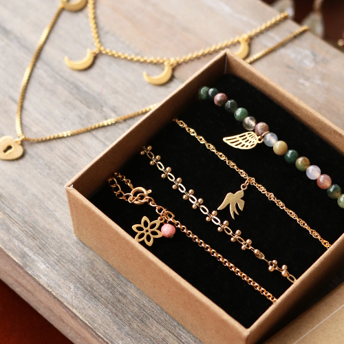 Abbiamo deciso di creare collane e bracciali raffinati con i ciondoli in acciaio inox. Inizia dalla scelta della catena a rolò. La catena rolò è disponibile in tantissime misure diverse, ma dato che abbiamo optato per un look raffinato, è meglio utilizzare una catena a rolò di dimensioni ridotte. Dopodiché, avrai bisogno di un moschettone per chiudere i bracciali e le collane. Ora viene la parte migliore: decora i tuoi gioielli con la nuova bellissima collezione di ciondoli in acciaio inox. Un’altra bell’idea consiste nel creare braccialetti di perline finissime per poi appendervi dei ciondoli in acciaio inox. Infila i braccialetti su un filo metallico, così potrai chiuderli nuovamente con un moschettone. In questo modo avrai creato un bel set variegato.