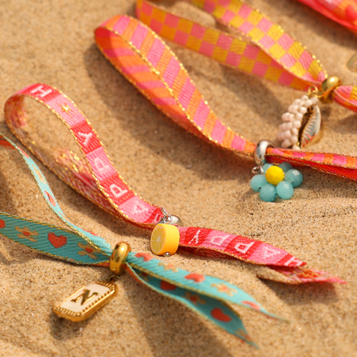 Questa nuova collezione di nastri con testo è stata progettata dal nostro team e include testi allegri come happy, ocean child e good vibes o disegni allegri come fiori e cuori. Con questa collezione, puoi creare le più carine cavigliere, cordini per occhiali e braccialetti.