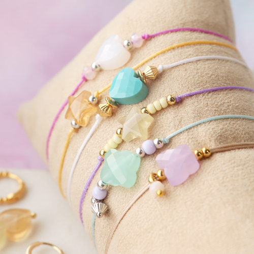 Le graziose forme delle nuove perline sfaccettate fashion sono ideali per realizzare gioielli alla moda! Per i bracciali puoi decidere di utilizzare vari colori di tendenza della stessa gamma. Posiziona una perlina sfaccettata fashion al centro della coda di topo. Dopodiché, infila una combinazione di perline rocailles Preciosa e perline di metallo DQ sul filo. Per un look ancora più brillante puoi aggiungere al gioiello le perline sfaccettate di piccole dimensioni. Chiudi il bracciale con la tecnica del nodo scorrevole. Per questa volta, scegli una coda di topo dello stesso colore della perlina sfaccettata fashion in modo da creare un contrasto vivace. Completa il look alla moda realizzando orecchini con perline sfaccettate fashion, chiodini e componenti per orecchini di metallo DQ. Divertiti a creare gioielli must have nei più bei colori di tendenza!