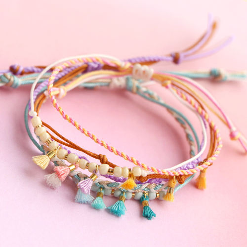 Poiché le mini nappine sono molto piccole, per creare dei bracciali è opportuno usare anche del materiale infilaperle. Scegli, ad esempio, la coda di topo o una catena a rolò sottile. Crea bracciali doppi con la coda di topo in 2 colori e combina le nappine con perline in metallo DQ e perline rocailles. Le nappine sono perfette anche con orecchini a cerchio a cui puoi fissarle con un anellino apribile.