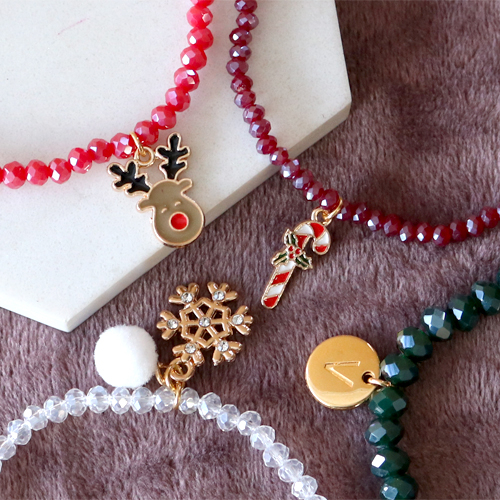 Cerchi qualche idea per realizzare meravigliosi gioielli per il Natale? Continua a leggere e lasciati ispirare! Noi ci siamo già messi alla prova e con questa nuovissima collezione di ciondoli natalizi abbiamo realizzato questi gioielli. Puoi realizzare molto facilmente dei meravigliosi orecchini appendendo un ciondolo natalizio a un componente per orecchini. Cerchi un tocco extra? Allora appendi agli orecchini una perlina sfaccettata come ciondolo extra. Puoi anche infilare le perline sfaccettate o le perline Polaris su un creolo e variare con le perline in metallo DQ e un ciondolo natalizio. Realizza bracciali abbinabili appendendo ciondoli natalizi o ciondoli con le iniziali a un braccialetto di perline sfaccettate. Oppure, mettiti alla prova con la catena a rolò. Utilizzando una catena a rolò dagli anelli grossi, puoi realizzare un bellissimo bracciale con ciondoli. Buon lavoro!