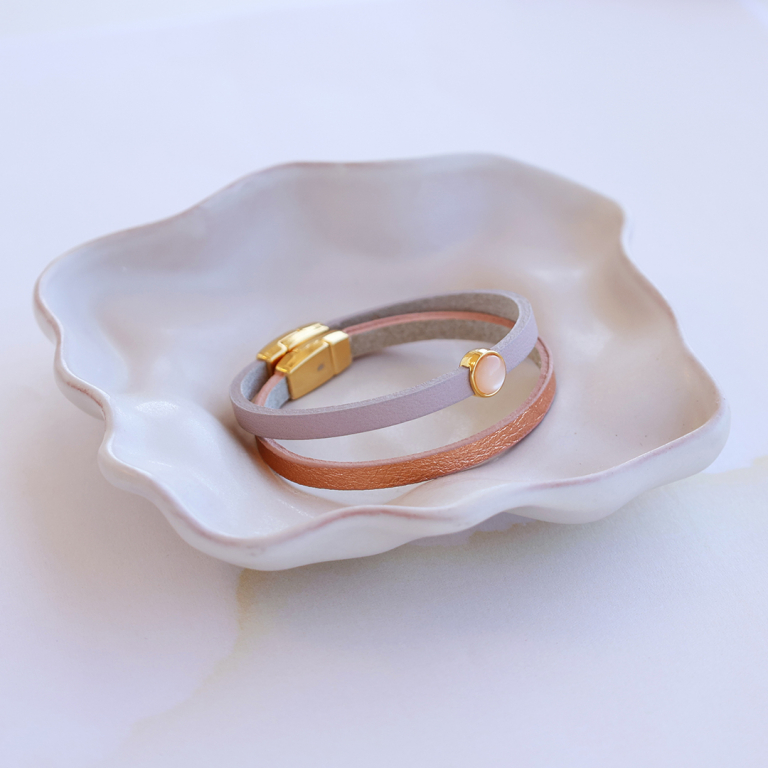 Queste bellissime pochette, portafogli e tracolla sono realizzati in cuoio Italiano. I portafogli sono disponibili in versione media e piccola. Puoi fissare le tracolle da 5 e 10 mm alle pochette o attaccarle ai braccialetti per creare un look elegante e raffinato.