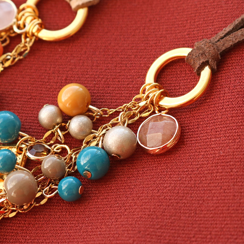 Le perline di vetro sono ovviamente dei veri e propri must-have, perché sono così versatili e possono essere utilizzate per qualsiasi cosa. Tuttavia, abbiamo scelto di creare veri bijoux in stile bohémien, ovvero due lunghe collane con orecchini abbinati. Le lunghe collane sono realizzate in pelle scamosciata finta e un anellino DQ. Li puoi appendere tutti i tipi di bellissime perline di vetro e altri oggetti, come il cristallo o le perline sfaccettate a forma di goccia, utilizzando una catena a rolò. Crea orecchini coordinati e la tua creazione è pronta!